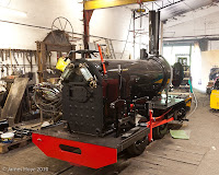 Wilst in the workshop, Brian the Duty Engineer wanted to show me the cab that he was painting over in the Horsepital. He explained that the primed areas (in grey) would be painted red and a blue coach line applied where the burgundy and red meet. He also showed me the two saddle tanks which were behind and explained that these were made from scratch.